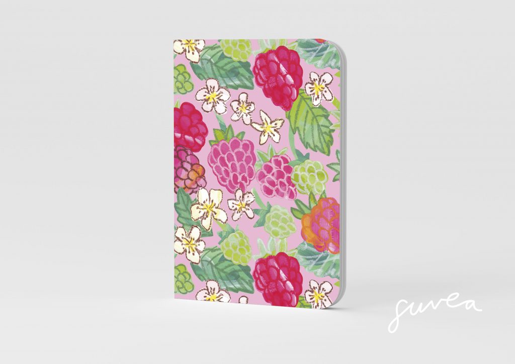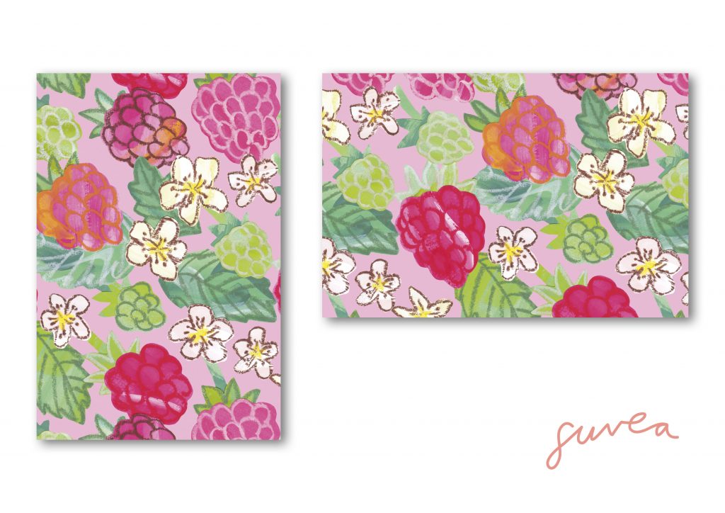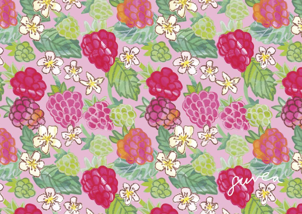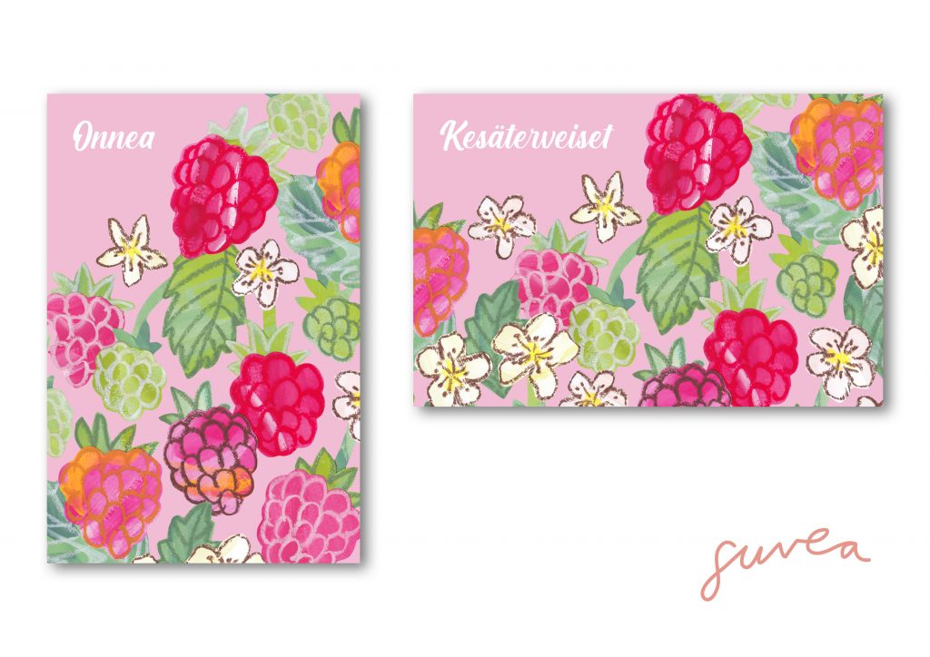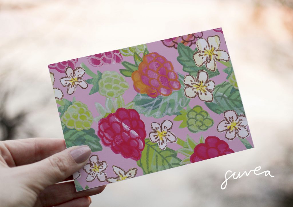 Pelkkä ajatuskin kesän vadelmista tuo veden kielelle. Tämä karkkiväreissä hehkuva ja vihjaileva kuosi on kortti- ja paperituotteina omiaan erilaisina kesäisinä tervehdyksinä ja onnitteluina.